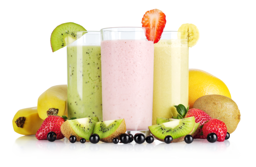 Clear drinking glasses and assorted fruits, Milkshake Smoothie Juice Fruit Banana, smoothies, food, recipe png